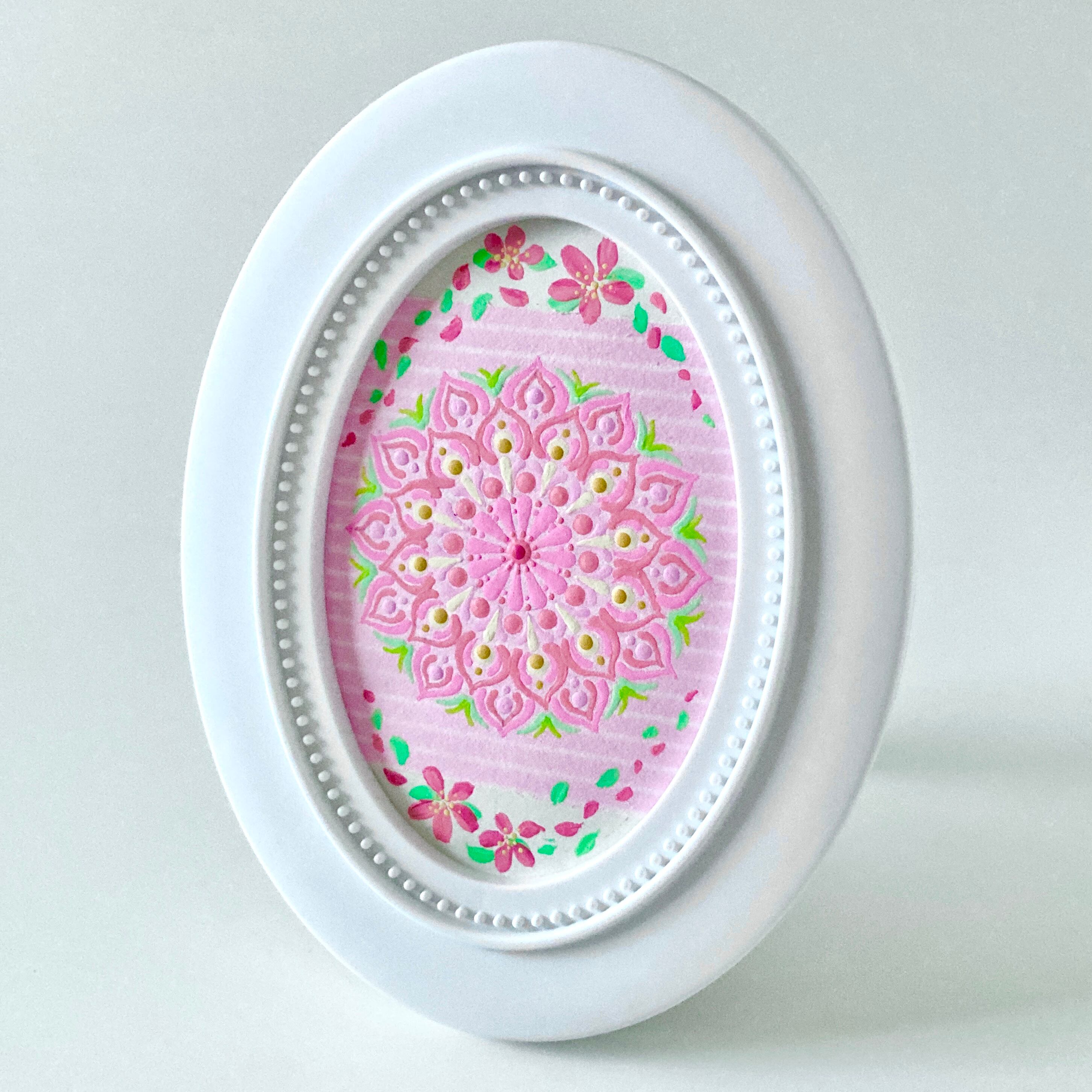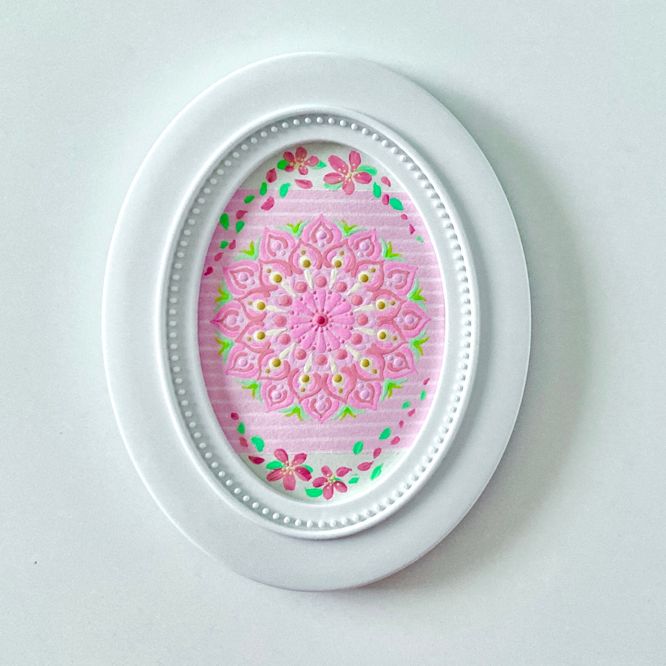 白とピンクのポップなボーダー柄の和紙と優しいクリーム色の和紙を合わせています。ピンクの桜とドットマンダラが見ているだけで癒しを与えてくれます。